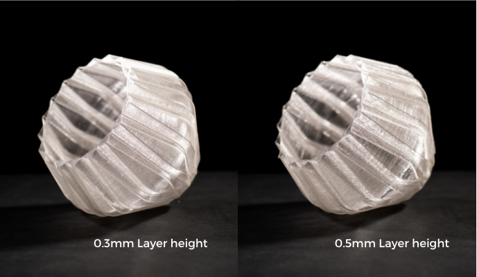 Al hacer esto las capas se funden mejor, reduciendo la visibilidad de las soldaduras entre capas y permitendo que la luz no se disperse. Además, al imprimir a mayor temperatura (dentro de los valores recomendados) hace que el material tenga un acabado brillante.