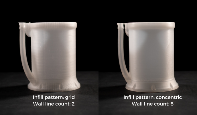 In 3D printing, pieces are generally not completely solid, consisting of a perimeter and an infill. Such structures are visible when printing with translucent material, which scatters light and reduces transparency.